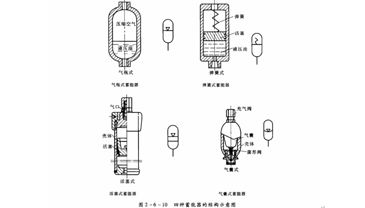 除彈簧式外,它們都是先通過充氣閥向氣囊或氣缸內(nèi)充入一定壓力的氣體,充氣后將充氣閥關(guān)閉,使氣體被封閉在氣囊或氣缸內(nèi)。工作時(shí),油液從蓄能器下部的液壓油人口進(jìn)入蓄能器,壓縮氣體直至達(dá)到平衡,這樣在蓄能器氣囊或氣缸下方的腔體內(nèi)就儲(chǔ)存了一定壓力的液壓油。其他的蓄能器的工作原理類似。