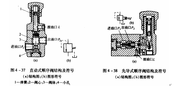 (2)先導(dǎo)式順序閥。圖4-38表示先導(dǎo)式順序閥結(jié)構(gòu)及符號(hào)。它的結(jié)構(gòu)與先導(dǎo)式溢流閥的結(jié)構(gòu)基本相同。但先導(dǎo)式順序閥來用單獨(dú)的泄油口L。它的工作原理是當(dāng)進(jìn)油油口(團(tuán)中未標(biāo))通入壓力油,其液壓力超過彈簧力,使進(jìn)出油口相通,操縱另一級(jí)執(zhí)行元件動(dòng)作。