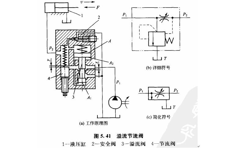 圖5.41為溢流節(jié)流閥的工作原理圖。圖中1是液壓缸.2是安全閥.3是定差溢流閥.4是節(jié)流閥。從液壓泵輸出的壓力油隊(duì),一部分通過節(jié)流閥4的閻口y.由州汕口處流出,壓力降為ρz.進(jìn)入液壓缸1.使活塞克服負(fù)載F以速度U運(yùn)動;另一部分則通過溢流閥3的閥口Z溢回油箱。溢流閥閥芯上端的彈簧腔與節(jié)流閥4的出口(pz)相通,其肩部的油腔和下端的油腔與入口壓力油如相通。在穩(wěn)定工況下,當(dāng)負(fù)載力F增加,即出口壓力pz增大時,溢流閥閥芯上端的壓力增加,閥芯下移,溢流口Z減小,液阻加大,使液壓泵供油壓力P1增加,因而使節(jié)流閥前后的壓差可基本保持不變。當(dāng)pz減少時,溢流閥溢流口x加大,液阻減少,使液壓泵出口隊(duì)相應(yīng)減小,同樣使基本保持不變。另外,當(dāng)負(fù)載扣超過安全閥的調(diào)定壓力時,安全閥2將開啟。溢流閥閥芯的受力平衡方程為