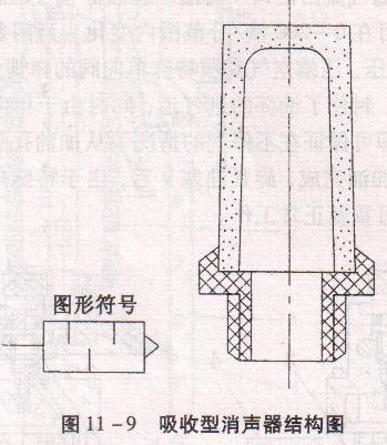 圖11 -9為四柱油壓機(jī)吸收型消聲器結(jié)構(gòu)圖。當(dāng)氣流通過由聚苯乙烯顆粒或銅珠燒結(jié)而成的消聲罩時,氣流與消聲材料的細(xì)孔相摩擦,聲能量被部分吸收轉(zhuǎn)化為熱能,從而降低了噪聲強(qiáng)度。這種消聲器可良好地消除中、高頻噪聲。